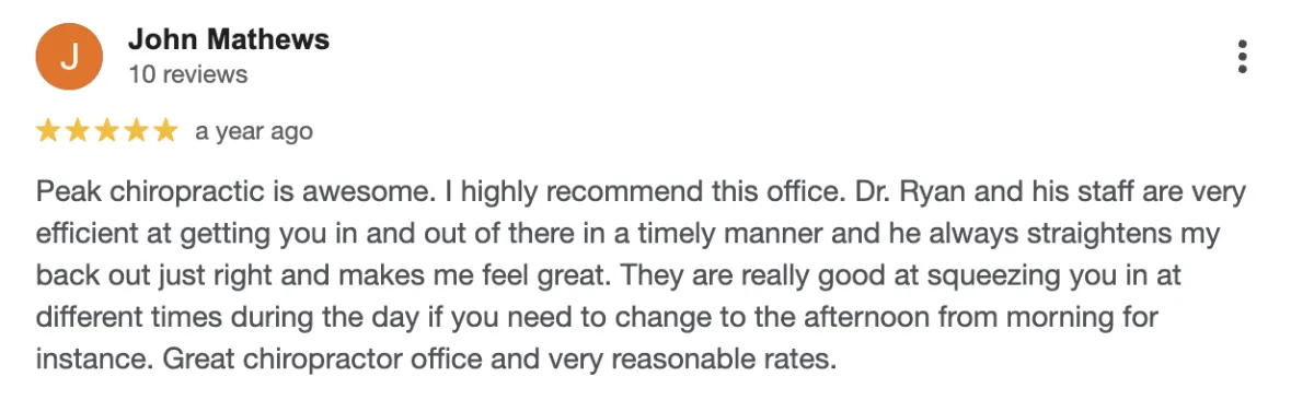 Disclaimer: Procedures and treatments performed by Peak Health Chiropractic & Acupuncture have an inherent success (and failure) rate. Reviews, testimonials and content on this site should not be interpreted as a statement of efficacy of procedures and treatments performed by Peak Health Chiropractic & Acupuncture for anyone else.